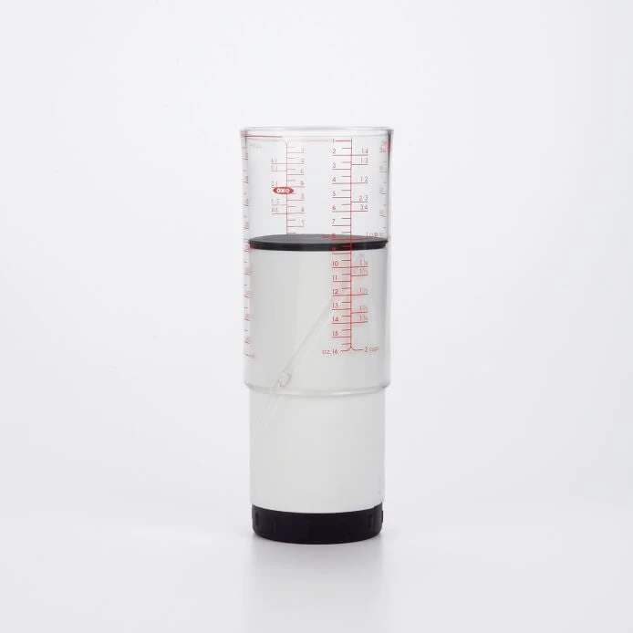 When adding sticky ingredients to recipes, there’s no need to choose between a mess or an imprecise quantity. Fill the Adjustable Measuring Cup and turn the knob to push contents right into your mixing bowl. The plunger acts as a squeegee, getting out every last bit. 1-Cup and Mini also available.
