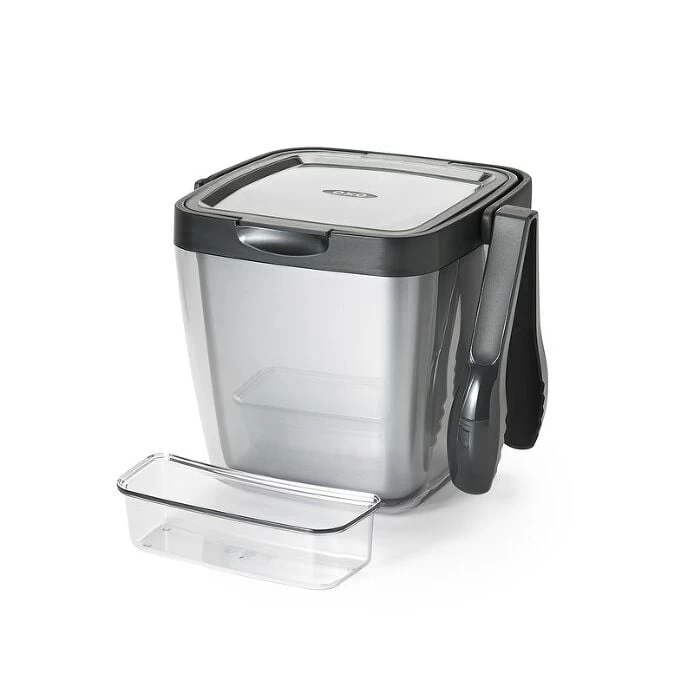 Be prepared for any party, inside or out, with this insulated Ice Bucket. Includes nylon tongs that hang conveniently from either side and a removable tray that holds drink garnishes. The carrying handle stays out of the way when not in use and the meltwater reservoir keeps meltwater away from cubes.