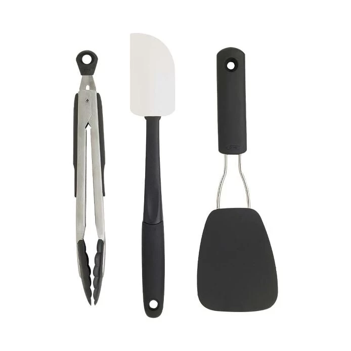This handy set features nylon- and silicone-based tools that are gentle on non-stick cookware. The Spatula has a heat resistant silicone head. The Turner and stainless steel Tongs have heat resistant nylon heads, and the Tongs lock closed for convenient storage.