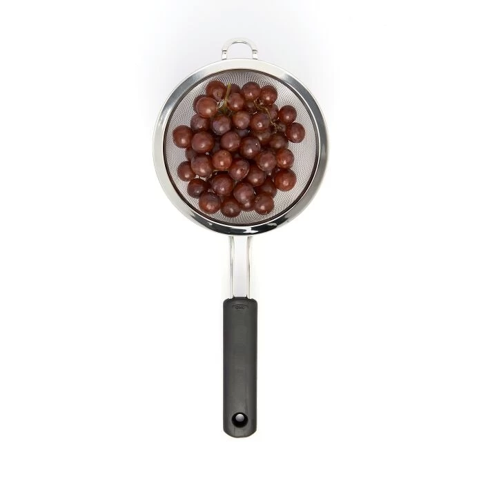 The fine mesh Strainer is ideal for rinsing and straining vegetables, berries, pasta and more. Stainless steel double rod construction makes it extra sturdy, and a small loop lets it rest on a pot or bowl. The soft, comfortable handle won’t slip, even when wet. Also available in 8″ size.
