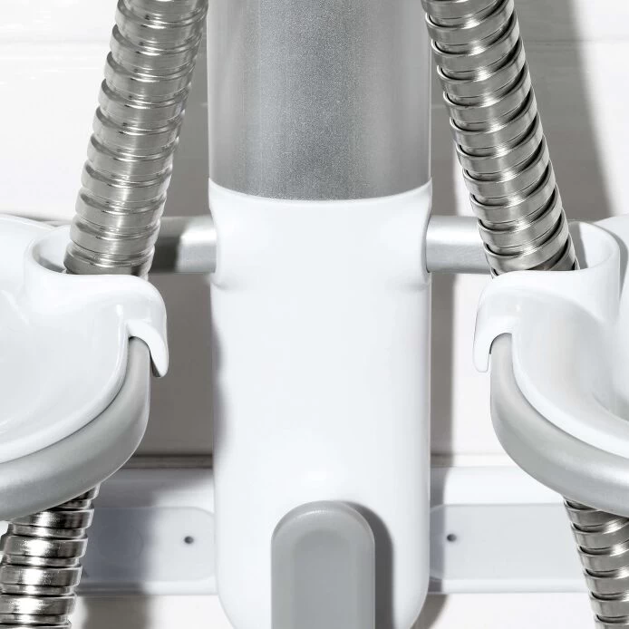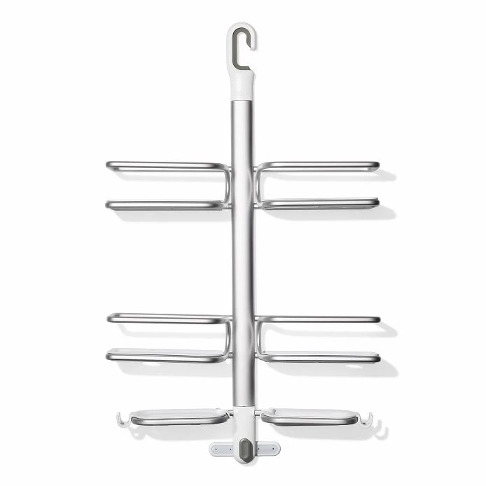 Unlike other caddies, the OXO Good Grips Aluminum Hose Keeper Shower Caddy is designed for hand-held shower hoses, with a channel down the center and shelves that keep the hose tucked away. Our StrongHold™ hook securely grips the showerhead for tool-free setup, and powerful suction cups add stability. Divided compartments help organize toiletries in shared bathrooms. The anodized aluminum Caddy won’t rust, and the shelf trays are removable for easy cleaning. Trays include drainage slots and bottle holes so you can store bottles upside down. Includes: 4 large-capacity shelves, 2 soap dishes and 4 hooks for razors, loofahs or washcloths.