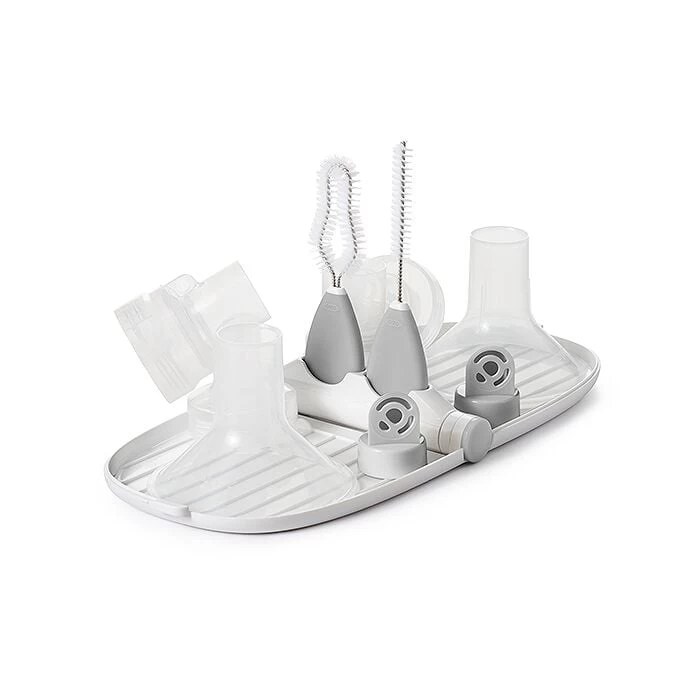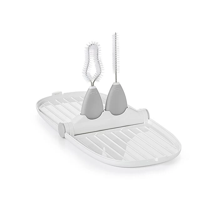 This compact Drying Rack features two cleaning brushes specifically designed for breast pump parts that store compactly inside and stand up automatically when the Rack is opened. The loop brush is perfect for breast shields, valves and connectors, while the detail brush is great for threads and other intricate spaces. The elevated ridges keep parts elevated above water for quick drying.
