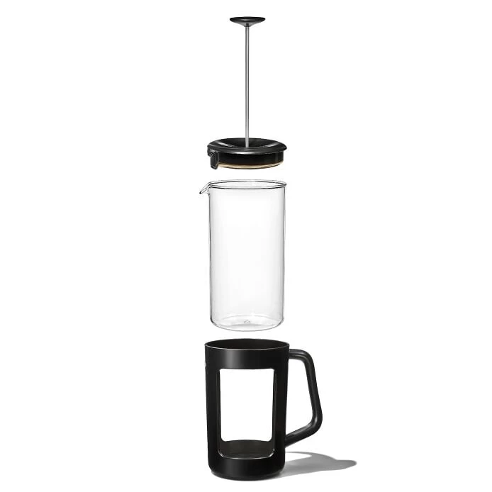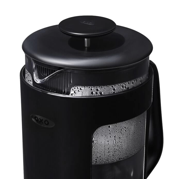 Coffee lovers can take their favorite way to brew on the road with the OXO Venture French Press. The clear carafe is made from durable, shatter-resistant BPA-free Tritan™ Renew* plastic, so it can withstand long car rides, a day at the beach, or wherever your next adventure may take you—even if it’s the backyard. Windows on both sides of the case show the coffee level, and the spout has a secondary level of filtration for a clean, rich taste. Best used with coarsely ground coffee, the 8-cup capacity is ideal for serving parties of two (or more). *Tritan™ Renew is made from certified recycled content through a mass balance allocation process that transforms plastics destined for landfills into high-performance, food-safe materials.