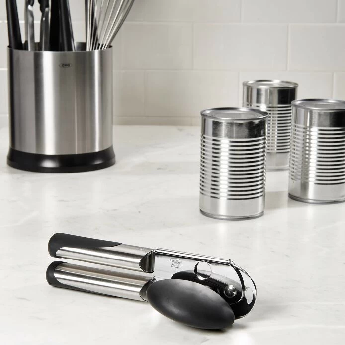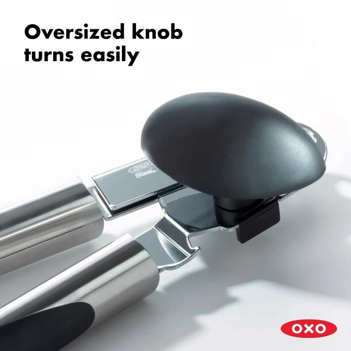 Our OXO SteeL Can Opener features stainless steel blades and a large, soft knob that’s easy to turn. Also includes a built-in bottle cap opener.