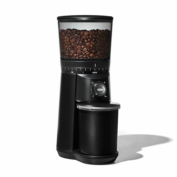 Because the best coffee starts from the grounds up, we created the OXO Conical Burr Coffee Grinder to help your beans unlock their full potential. The design is simple, so nothing stands between you and your first cup. Just add beans and choose from 15 grind size settings – from fine for espresso to coarse for French press – turn the dial to select grinding time, and push to start. Stainless steel conical burrs create uniform grounds, for golden cup standard flavor, and the one-touch timer keeps your last setting, so you don’t have to reset it every time. It has a powerful DC motor that works to preserve the flavor of your beans and won’t overheat them. The matte black finish adds an elevated texture and finish to your kitchen or at-home coffee bar. 2-Year limited warranty.