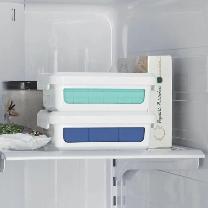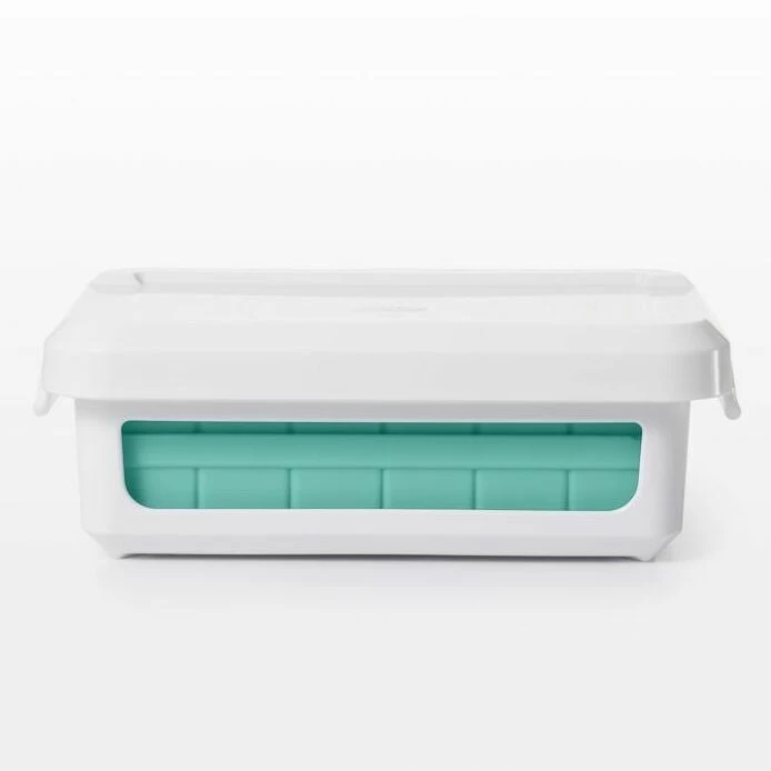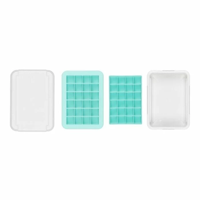 With two separate trays, this Covered Silicone Ice Cube Tray makes 48 small (7/8″ square) cubes in total. Flexible silicone allows for easy removal, while the frame provides support during filling, moving and storage. Cover keeps out odors and allows for stacking multiple trays.