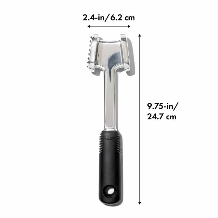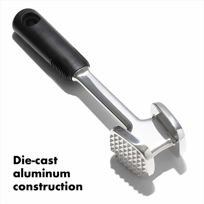 This die-cast aluminum meat tenderizer lets you pound meat flat for faster cooking. The pyramid-shaped teeth are perfect for breaking down tougher cuts, while the flat side makes short work of flattening poultry, pork and beef to a uniform thickness for even cooking. The angle of the head is designed to maximize force, while heavy-duty construction provides just the right weight. The soft, non-slip handle fits comfortably in your hand and stays put, even when wet.