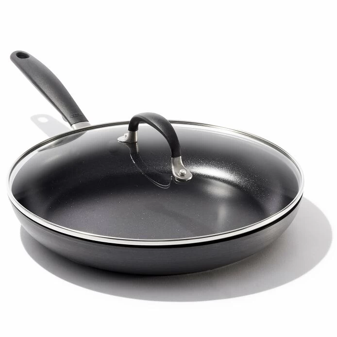 The 12-in OXO Good Grips Non-Stick Frying Pan with Lid is your go-to pan for family meals. It features a three-layer, German-engineered non-stick coating that provides effortless performance while using less oil and makes cleanup quick and easy. The durable glass lid makes it easy to check on your progress, whether you’re cooking chicken or melting cheese. Our pan’s scratch-resistant, hard-anodized body heats faster and more evenly than traditional aluminum, and the silicone-wrapped stainless steel handle helps keep cooking comfortable. Hand wash. Oven safe up to 390°F/200°C. 10-year limited warranty.
