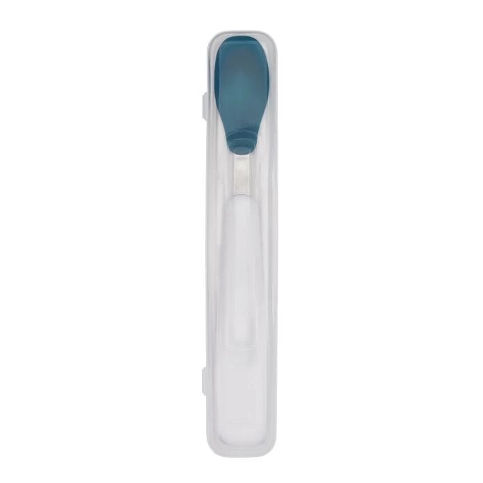 Food-grade silicone coating gives this Feeding Spoon a soft touch. Each shallow spoonful holds just enough for baby’s mouth, and is soft enough to scrape the last bits out of the bowl or wipe them off of baby’s face. Spoon fits neatly into the compact carrying case.