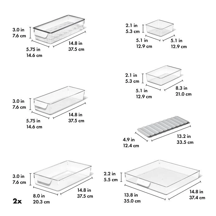 Longing to finally organize the contents of your fridge? Seeking a better way to keep an eye on expired food? The OXO 8-Piece Refrigerator Organization Set has everything you need for a complete fridge overhaul. The modular system keeps produce, beverages, condiments and more, tidy and well-organized. Each component is designed to work together and is versatile enough to give you the customization you need. Our set includes two sizes of bins for a visually pleasing way to contain food, find it fast and keep tabs on when it’s time to restock. Two sizes of trays offer a helping hand to sort bulk meat, poultry, dairy and produce, while a spacious clear lidded egg bin keeps fragile eggs protected. We’ve even included a clever dual-sided mat designed to keep beverage cans or bottles from rolling away. With our 8-Piece Refrigerator Organization Set we’ve got your fridge needs covered.