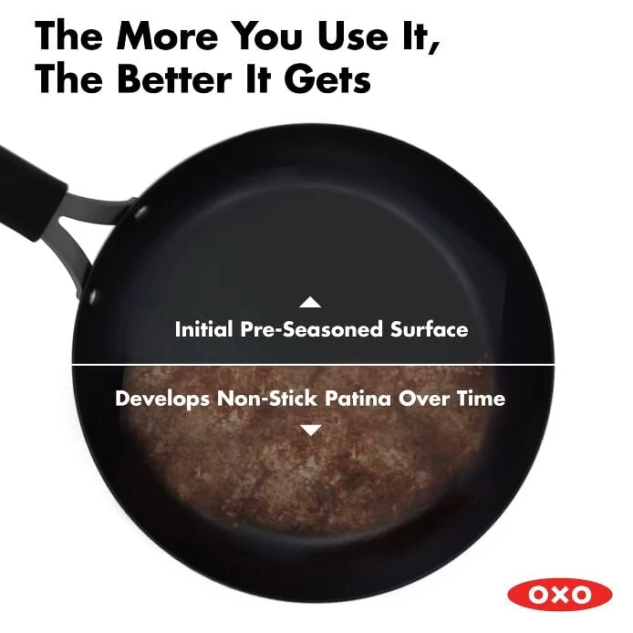 Lighter, easier and stronger—there’s a reason carbon steel is the choice of pros. Pre-seasoned to get you started, this OXO Obsidian Outdoor Carbon Steel 12-In Frypan develops a naturally non-stick layer with use that’s ideal for grilling delicate fish, cooking veggies over an open flame, or smoking bacon on the grill. The more you use the pan, the better the non-stick patina layer will be. Precision engineered for powerful performance, this pan travels is an easy way to supercharge your outdoor cooking. This pan also comes with a removable silicone sleeve to keep cooking comfortable. Hand wash only.