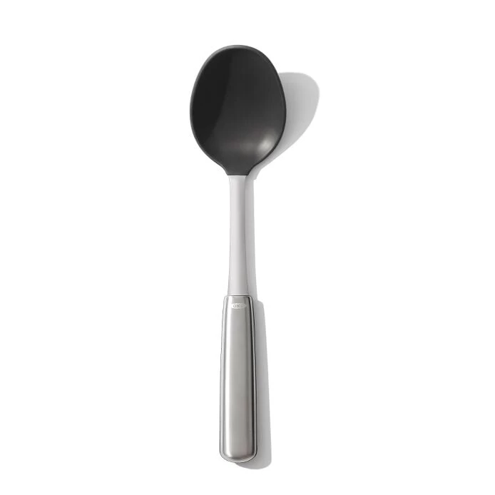 If you own non-stick pots and pans, the OXO Steel Silicone Cooking Spoon is a must have. It has the strength and durability of a stainless steel spoon, but the heat-safe silicone head makes it extra gentle. Which means you can stir and serve with ease and you won’t have to worry about scratching the pot’s finish or your hard-earned cast iron seasoning. It also has a comfortable handle with a non-slip touchpoint and a sleek, timeless design that’ll look great in the kitchen and at the table. Use it to stir soups, serve meatballs, dish out mac and cheese, and other family favorites. Dishwasher safe.