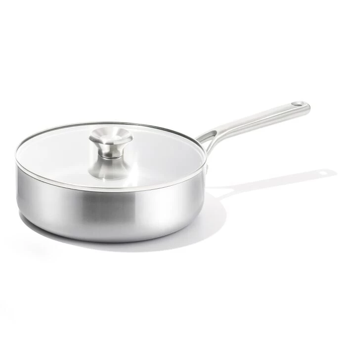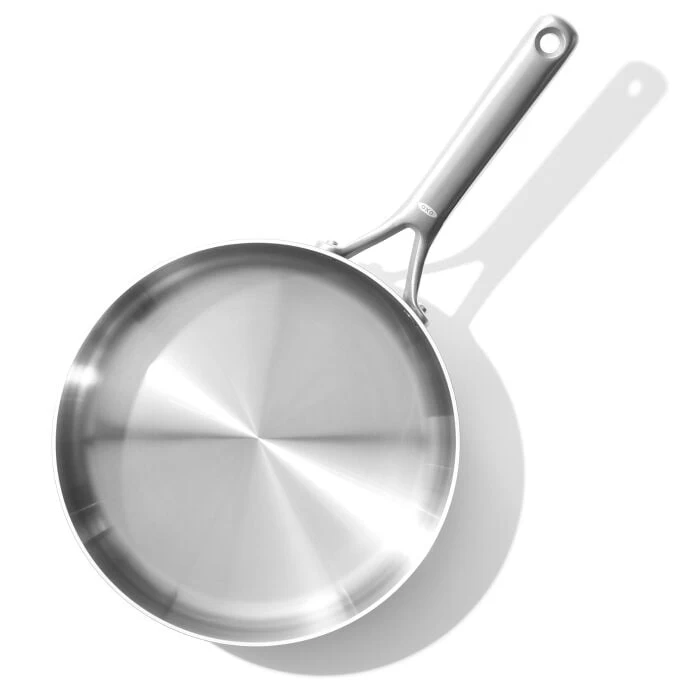 The OXO Tri-Ply Stainless Mira Series is a line of cookware that features two layers of stainless steel with a heat-radiant aluminum core, a combination that evenly distributes heat for uniform cooking, all while being metal utensil safe. The stain-resistant finish features evershine technology to help prevent heat discoloration and keep your pan looking good as new. The lightweight, contoured stainless steel handle provides a comfortable grip while cooking, and the 12-in Fry Pan is perfect for searing pork chops, sautéing vegetables and making family dinners. The rivets are streamlined for a seamless, snag-free interior which makes for effortless cleanup. The Pan is induction ready, oven safe up to 600°F/325.5°C and dishwasher safe.