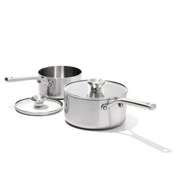The OXO Tri-Ply Stainless Mira Series is a line of cookware that features two layers of stainless steel with a heat-radiant aluminum core, a combination that evenly distributes heat for uniform cooking, all while being metal utensil safe. The stain-resistant finish features evershine technology to help prevent heat discoloration and keep your pots looking good as new. The lightweight, contoured stainless steel handle provides a comfortable grip while cooking. The rivets are streamlined for a seamless, snag-free interior which makes for effortless cleanup. These pots are induction ready, oven safe up to 600°F/325.5°C and dishwasher safe.