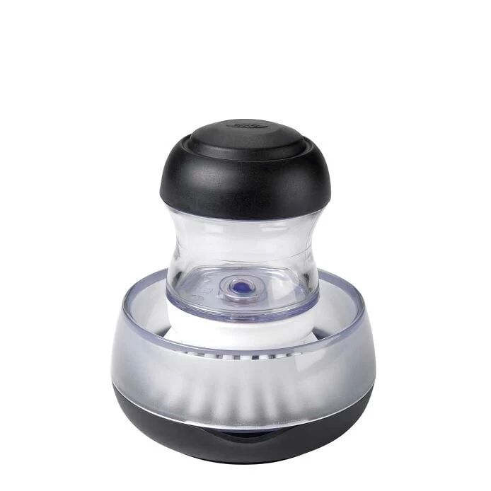 Includes a Soap Dispensing Palm Brush and a companion holder to catch excess water. Holder features a removable drip tray and built-in pour spout to keep counters clean and dry. A non-skid base keeps the holder in place. Brush has durable nylon bristles that are safe to use on non-stick cookware.