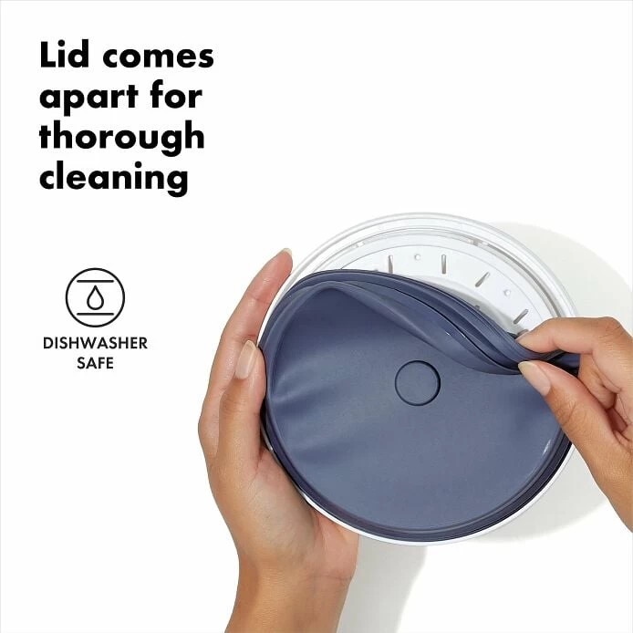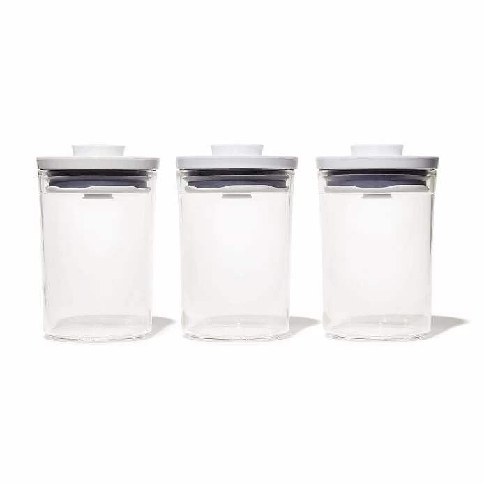 Keep cotton balls, hair accessories and makeup tools tidy with the OXO Good Grips Round POP Container 3-Piece Set. Each Container has a push-button lid that creates an airtight seal—and the button pops up for easy, one-handed opening. POP Containers aren’t just for bathrooms: Use them any place you want more organization. Each Container is designed to fit household staples like cereal, flour, sugar, pasta, rice, coffee, nuts, snacks and more. For best results, always use the button to open and close. Do not carry POP Containers by the lid. BPA free. Dishwasher safe. Set includes: three 0.6 Qt/0.6 L Containers