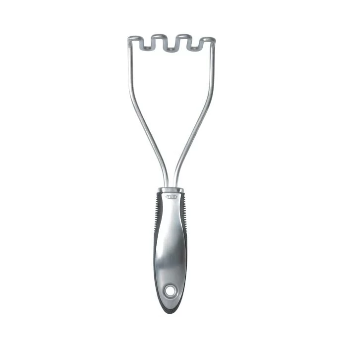 The OXO SteeL Potato Masher features brushed stainless steel handles and a professional stainless steel wire head that efficiently mashes potatoes. Our trademark flexible fins provide comfort during repetitive motions. Also works great on other root vegetables, or for mashing homemade baby food.