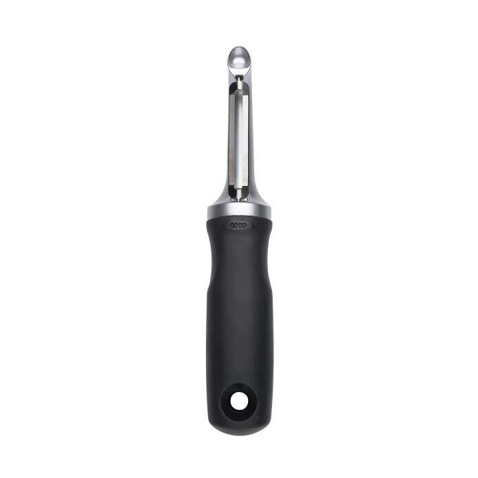 The Pro Swivel Peeler is constructed from sturdy die-cast zinc and features a precision-ground, extra-hardened stainless steel blade for durability and efficiency. Also includes an eyer for removing blemishes.
