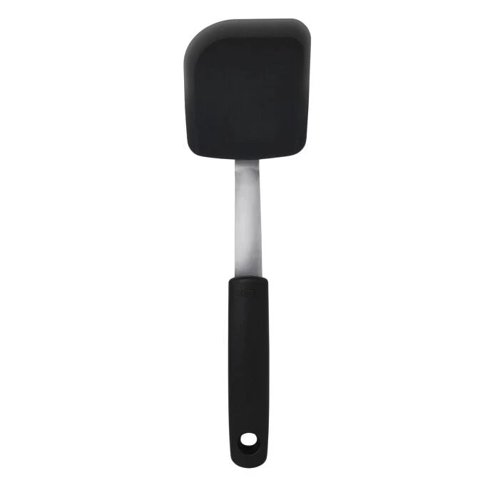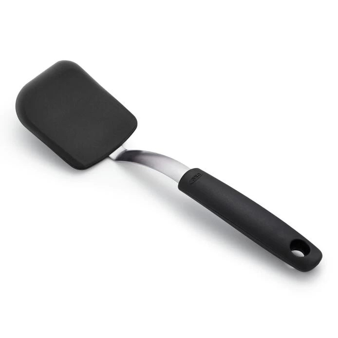 Our Silicone Cookie Spatula combines the strength of stainless steel with the heat resistance and non-stick friendliness of a silicone outer layer. Thin, flexible edges glide under foods to keep them intact. Rounded corner is great for getting cookie dough out of the spoon.