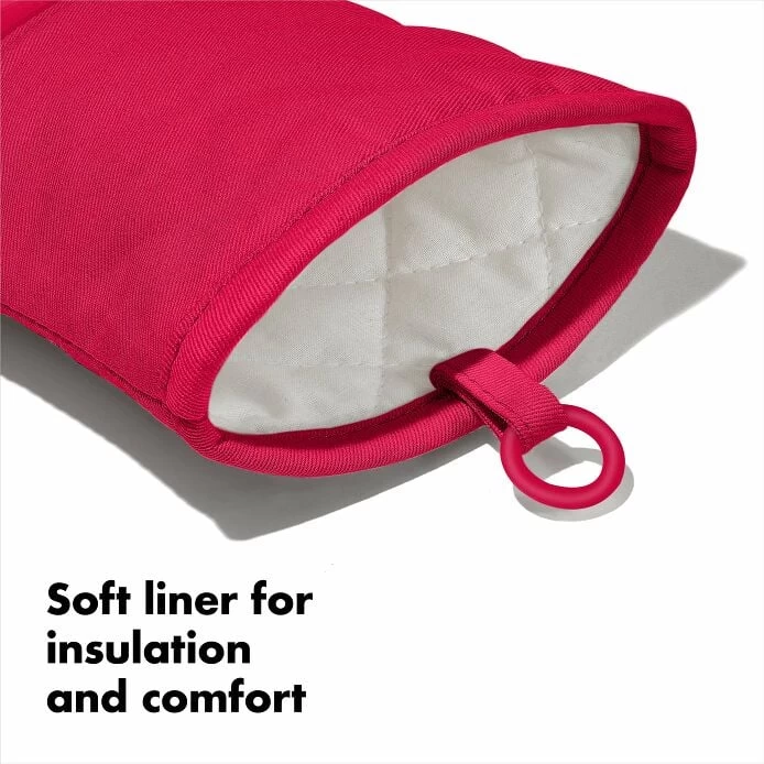 Handle hot items safely and confidently with the OXO Good Grips Silicone Oven Mitt. The body is constructed of heat-, flame-, water- and stain-resistant silicone, with a non-slip diamond pattern that’s concentrated at contact points for extra protection. Our 13-in/33 cm Mitt protects your arms with a tapered fit and soft fabric interior that offers control and comfort without sacrificing dexterity. When you’re finished, rinse the Oven Mitt clean, wipe it down with a damp cloth or toss it in the washing machine. Includes hanging loop for convenient storage.