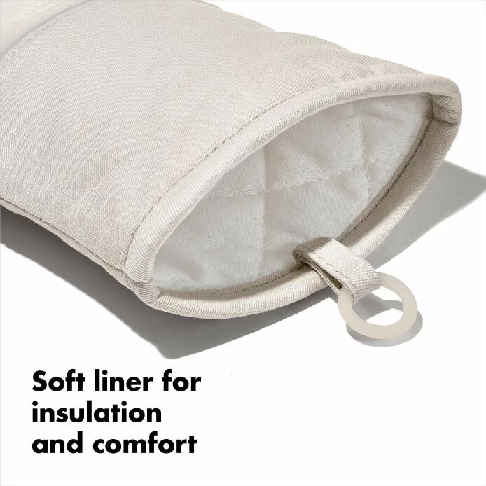 Handle hot items safely and confidently with the OXO Good Grips Silicone Oven Mitt. The body is constructed of heat-, flame-, water- and stain-resistant silicone, with a non-slip diamond pattern that’s concentrated at contact points for extra protection. Our 13-in/33 cm Mitt protects your arms with a tapered fit and soft fabric interior that offers control and comfort without sacrificing dexterity. When you’re finished, rinse the Oven Mitt clean, wipe it down with a damp cloth or toss it in the washing machine. Includes hanging loop for convenient storage.