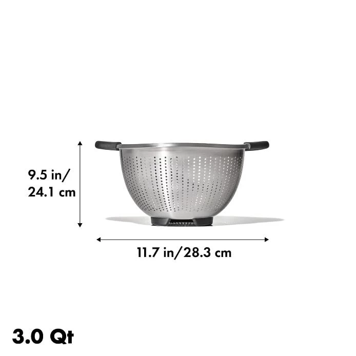 Whether you’re rinsing veggies or straining pasta, the OXO Good Grips 3-Qt Stainless Steel Colander is ready for the job. Elevated, non-slip handles provide a firm and comfortable grip, even when handling large batches. Our Colander is constructed with three feet at the base that deliver stability in the sink and on the countertop and nest neatly in our Stainless Steel Mixing Bowls for convenient straining and storage. The perforated design ensures fast and thorough straining. Also available in 5-qt size.