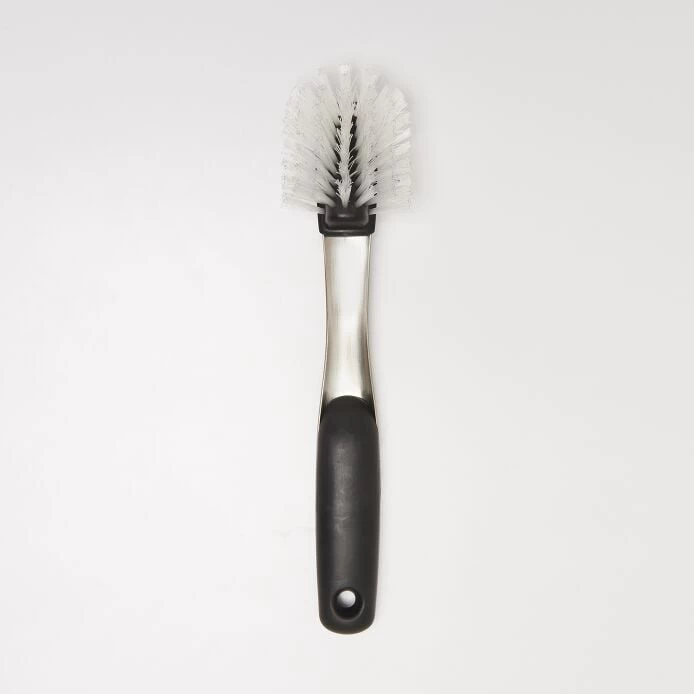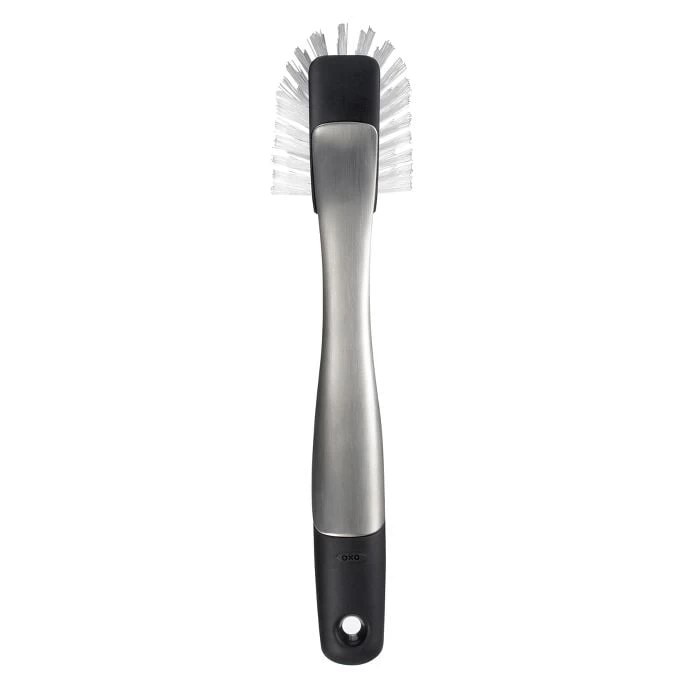 Our SteeL Dish Brush features durable, nylon bristles and built-in scraper. Both are safe for non-stick cookware and help remove baked-on food. Brushed stainless steel body adds a touch of elegance. Soft, non-slip handle provides a secure grip, even when wet. Dishwasher safe.