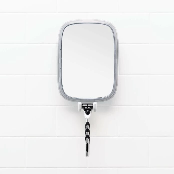 Master your morning routine with the OXO Good Grips StrongHold™Suction Fogless Shower Mirror. The phthalate-free StrongHold™ suction cup securely locks the Mirror onto shower surfaces. The suction cup attaches with the flip of a lever, ensuring a sturdy hold without the need for tools. Fill the internal reservoir with hot water before each shower to keep the surface clear: Equalizing the temperature stops condensation and fog from forming. The acrylic Mirror surface is shatterproof, and the included hooks are a handy place to store razors and washcloths. For best results, use on smooth glazed surfaces, mirrors or glass. Not recommended for use with textured or porous surfaces including some stone, acrylic or metal.